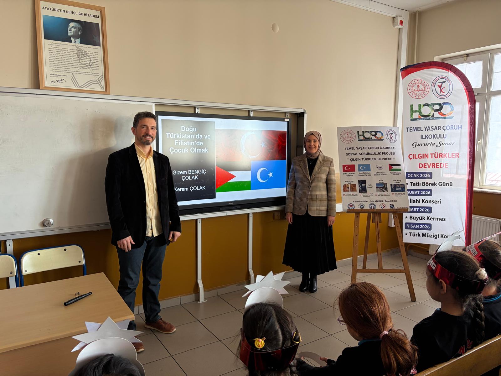 Temel Yaşar Çoruh İlkokulu öğretmenleri Sait Atakan ve Barış Kılınç tarafından HOPO kapsamında planlanan “Çılgın Türkler Devrede” adlı projeye, Dr. Öğr. Üyesi Gizem Bengiç Çolak ve Doç. Dr. Kerem Çolak tarafından akademik destek sağlanmıştır. Bu kapsamda, 15.01.2026 tarihinde “Doğu Türkistan’da ve Filistin’de Çocuk Olmak” başlıklı bir seminer gerçekleştirilmiştir.