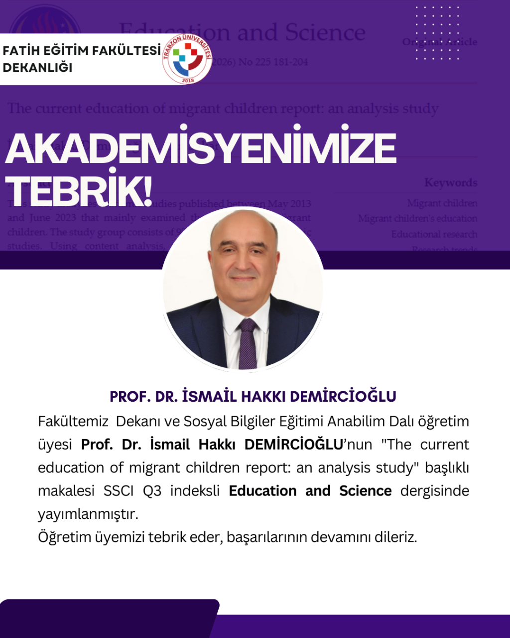 Fakültemiz Dekanı ve Bölümümüz Sosyal Bilgiler Eğitimi Anabilim Dalı öğretim üyesi Prof. Dr. İsmail Hakkı Demircioğlu’nun “The Current Education of Migrant Children Report: an Analysis Study” başlıklı makalesi SSCI Q3 indeksli Education and Science dergisinde yayımlanmıştır.