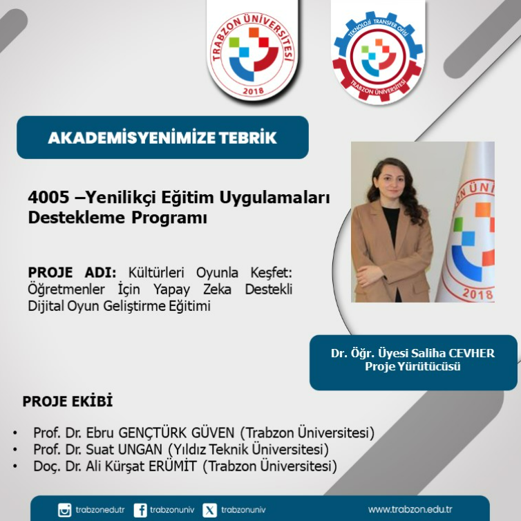 Bölümümüz Sosyal Bilgiler Eğitimi Anabilim Dalı Öğretim Üyesi Dr. Öğr. Üyesi Saliha CEVHER’in “Kültürleri Oyunla Keşfet: Öğretmenler İçin Yapay Zeka Destekli Dijital Oyun Geliştirme Eğitimi” başlıklı projesi "4005 – Yenilikçi Eğitim Uygulamaları Destekleme Programı" kapsamında desteklenmiştir.